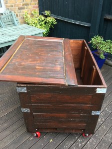 This study wooden storage unit has been upcycled. It’s Upcycled with pallet wood and stained for protection. It can be used as a storage or as a movable table in the Garden. It has been stained with three coats of ronseal satin quick dry strainer. The sides have also had three coats of colour oak stain for protection It has heavy duty castors, 600 kg capacity and very portable. The water proof green lid offers extra adverse weather protection