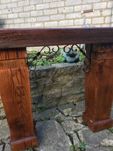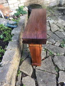This beautiful piece of garden furniture has a sleeper as a top and solid carved oak legs. The sleeper is hard wood either jarra or Mahogony hard wood all of which have been reclaimed