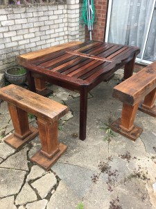 This beautiful Garden furniture set consists of a P.J Bridgemam & co hardwood garden (genuine iroko hardwood) table that has been restored and revarnished along with a set of four sleeper benches made with. Carved sold oak legs and hard wood seats