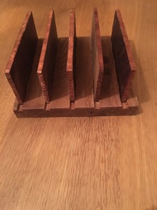 A set of four chunky hand made hard wood mahogany coasters with holder. The coasters are made from mahogany wood and the holder is made from reclaimed Elm wood