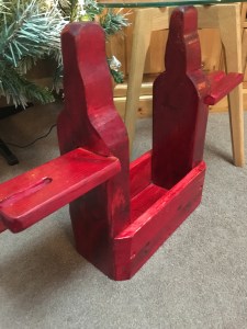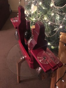 This hand made bottle and glass holder has been made from reclaimed and repurposed wood. The sides in the shape of a bottle is made of oak wood the guards and wine glass holders are made from pine.