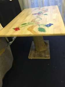 This rescued tree stump has been utilised as a garden table. It has been set on a set of heavy duty wheels to make it easily mobile and has had three coats of yacht varnish for protection.
