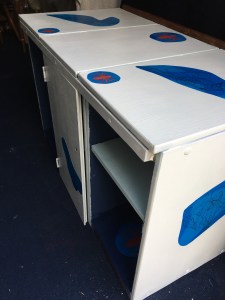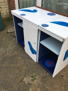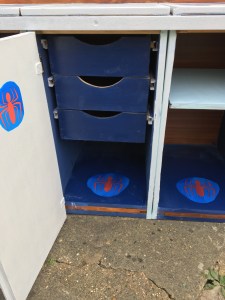 This unit has been built and made into a child’s storage sideboard. It has three compartments, the centre one has three small draws