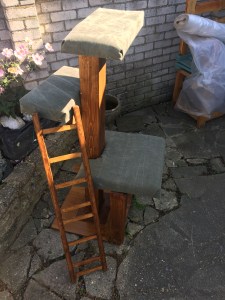 This is a hand made cat climbing frame. All the wood and materials used have either reclaimed or re-purposed.. Each platform is padded with cushion for comfort but has been upholstered with heavy duty canvas type material for toughness and durability.
