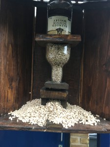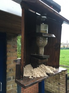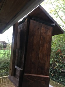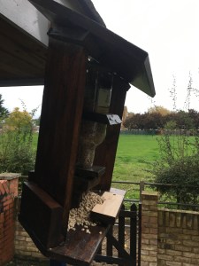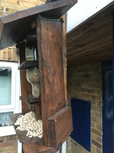 This is a hand made novel idea bird feeder. This item is made entirely from reclaimed wood as well as reusing an old whiskey bottle, that dispenses the feed. It has a slanting roof to protect the structure and the feeding birds.