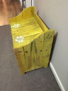 This quaint hand made storage box has been carved from reclaimed wood. It ideal for out door garden storage of wine and beers at that bbq or odds and ends that you want kept in one place. The wood has been dyed allowing the beautiful grain and knots to shine through, It been varnished to give it extra protection and a glossy finish