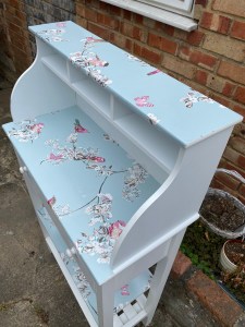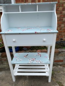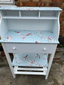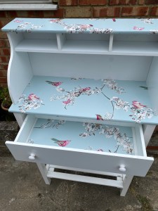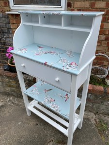 This piece of furniture has been restored and Upcycled to make it into a delightful piece that could be utilised in any room. With two shelves at the base, a large draw and cubicles at the top. It is a handy unit