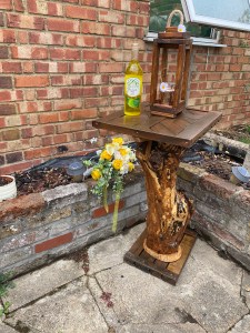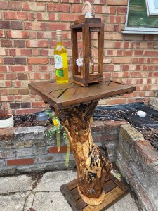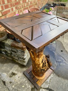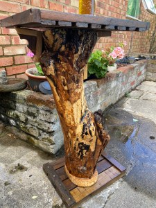 The top and base have been in three coats of Ronseal exterior wood stain which offer 10 year guarantee and the Log with Ronseal yacht varnish