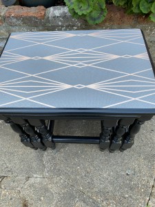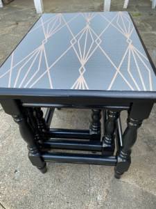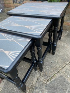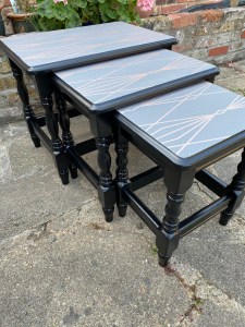 A striking nest of up cycled wooden tables. These have been tastefully up cycled, painted and decoupaged making them a unique one off set.