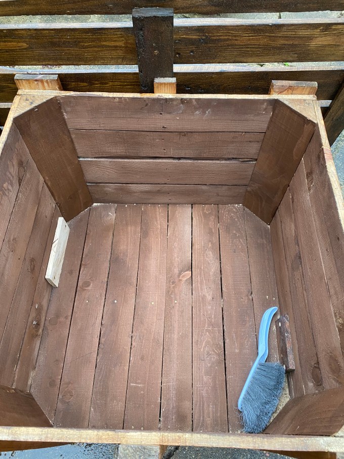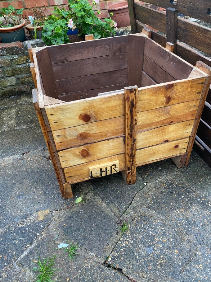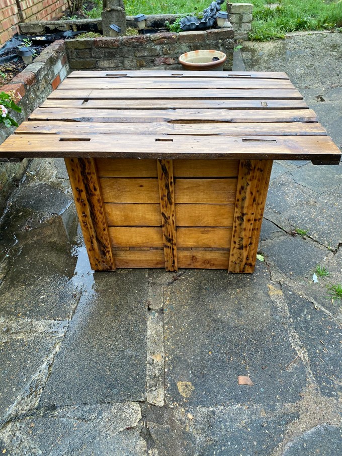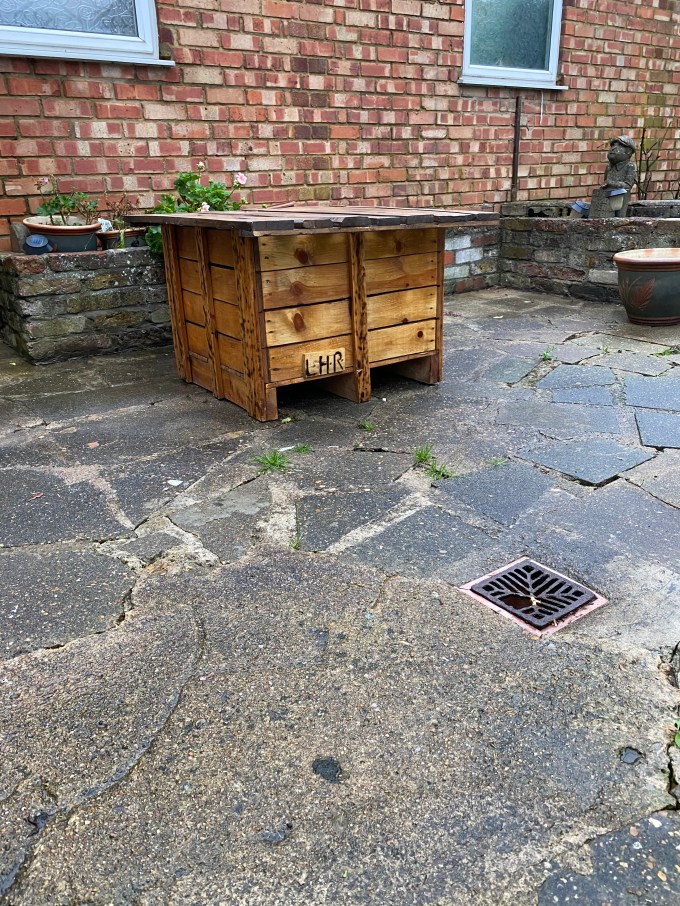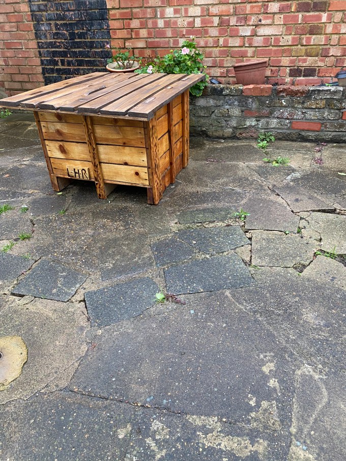 This garden table has been made from an unwanted and crate as a base and storage and the top is slate of reclaimed pallet wood