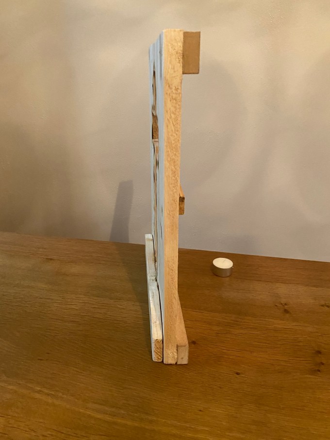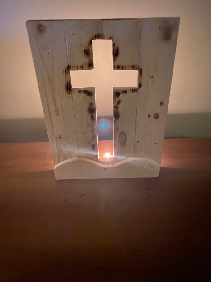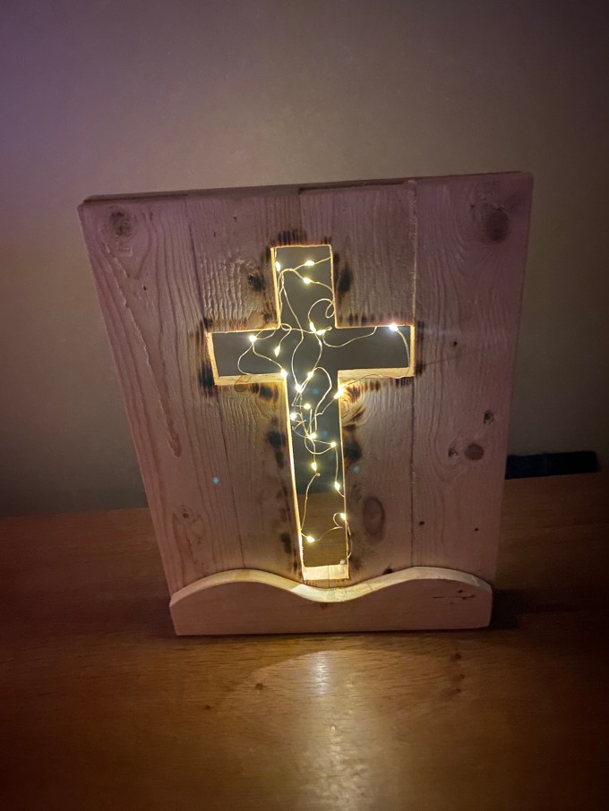 This is a Handmade rustic crucifix with it’s out line highlighted to make it stand out. It can be stood upright or hanged up with Any colour as a background to make your cross standout or with a tea light when a stood alone