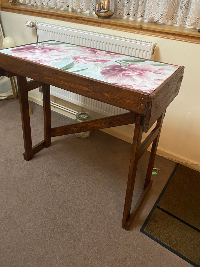 This is a hand made beauticians folding table, all materials used were reclaimed or rescued. It has a decoupaged top and stained wooden legs. This was made to a customers specs , 80 cm height 80cm width and 40cm depth.