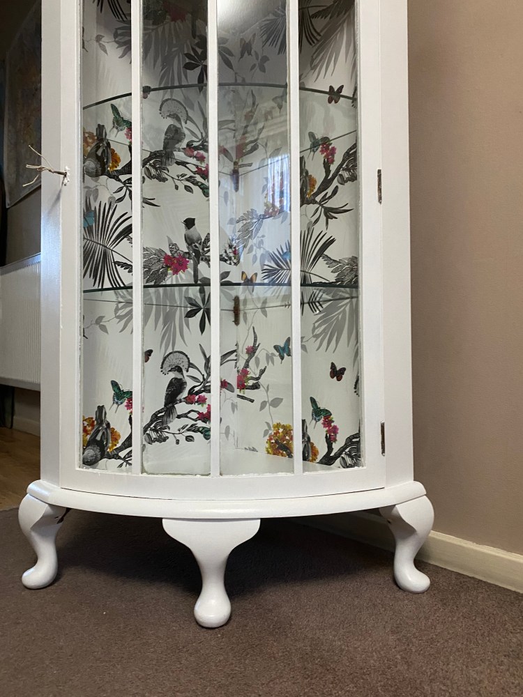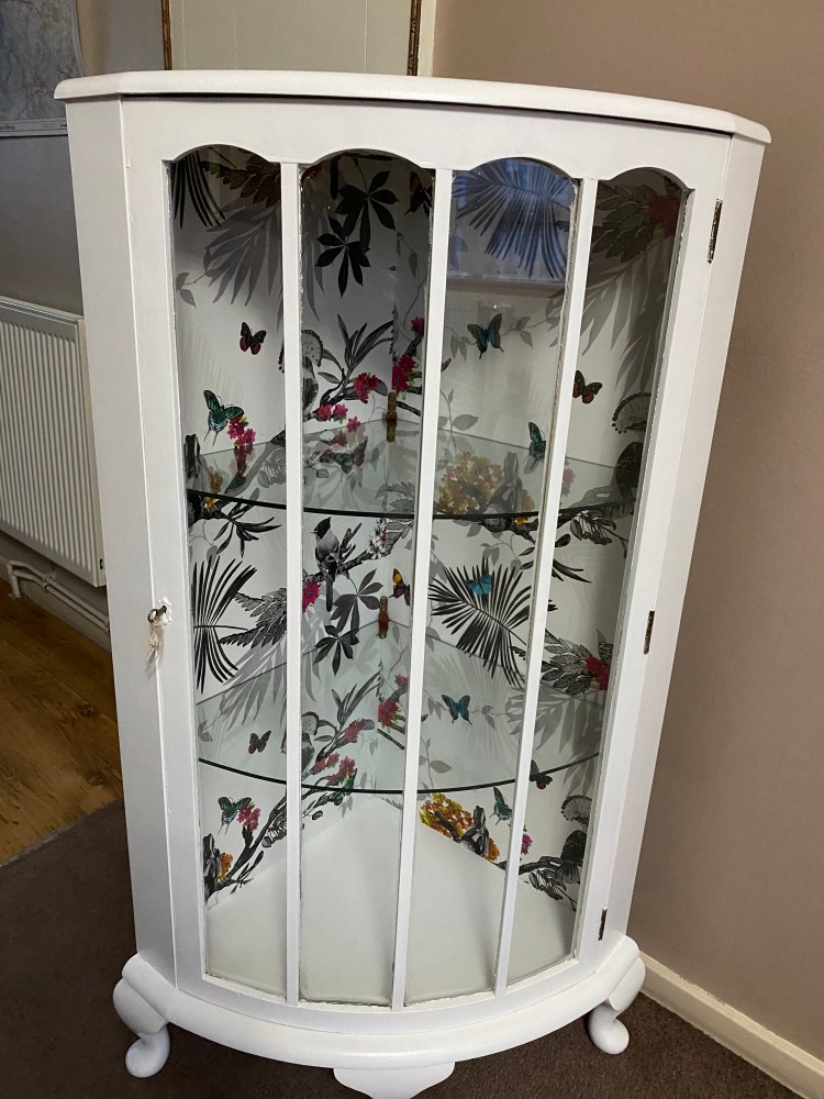 This vintage unit has been rescued, Restored and exquisitely up cycled. With a vibrant decoupaged interior, three glass shelves and a a lockable door with key, this unit would brighten up any room