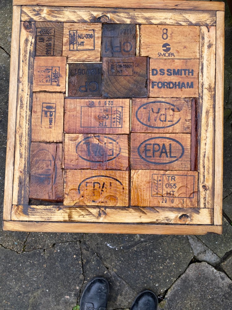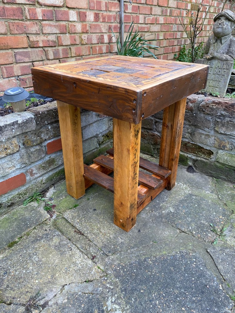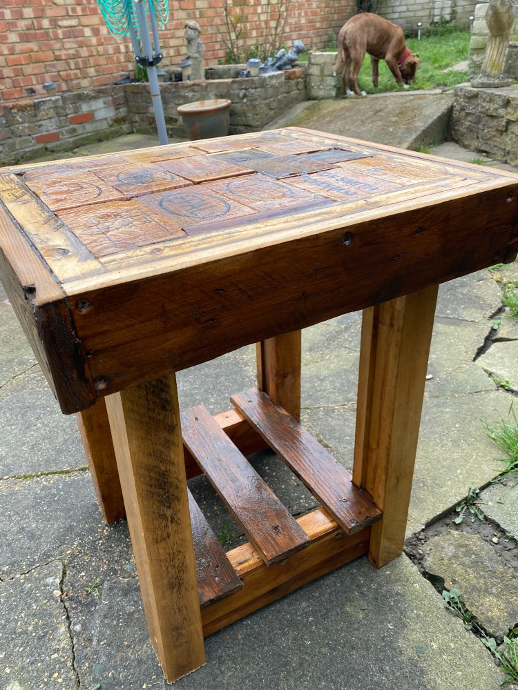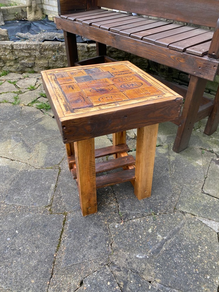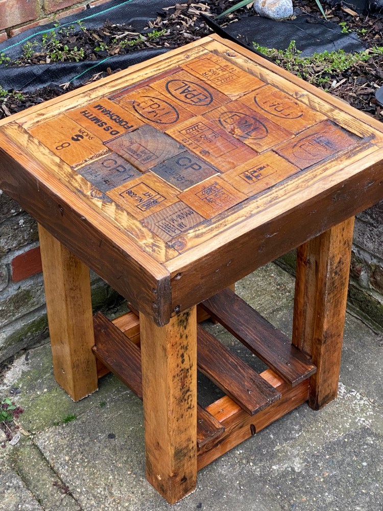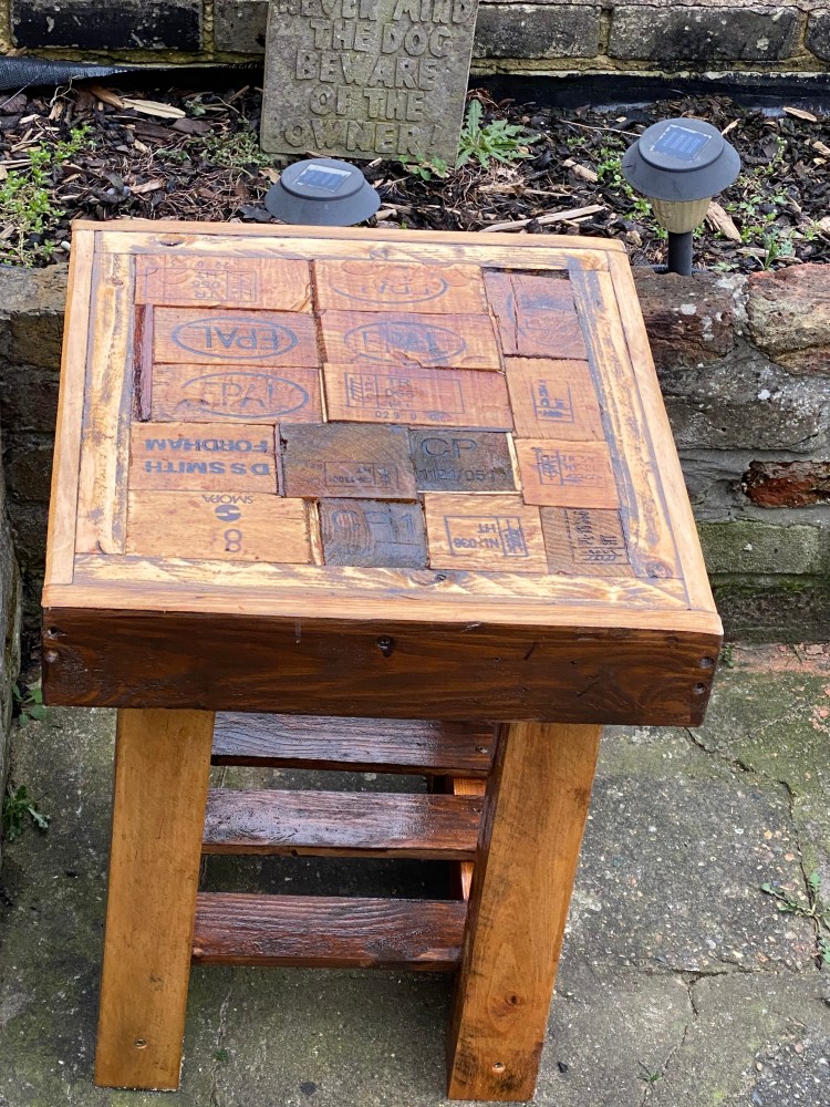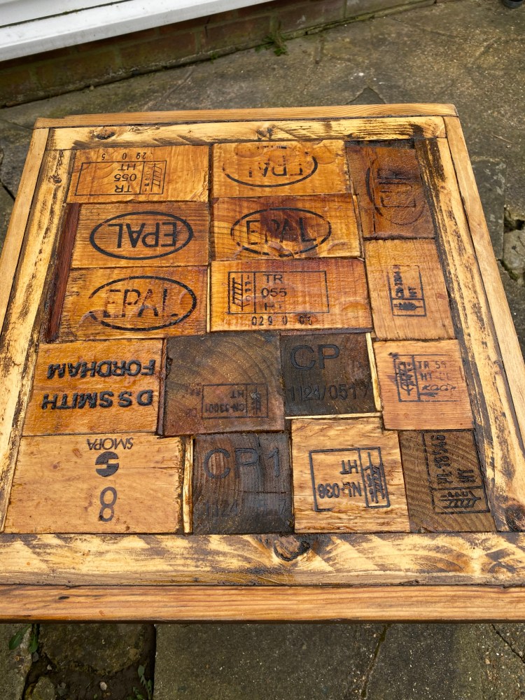 This is a handmade small garden table made entirely from reclaimed wood. The top is made from hand picked pallets blocks that are all emblazoned with a motif. With a high gloss finish adding to it’s attraction