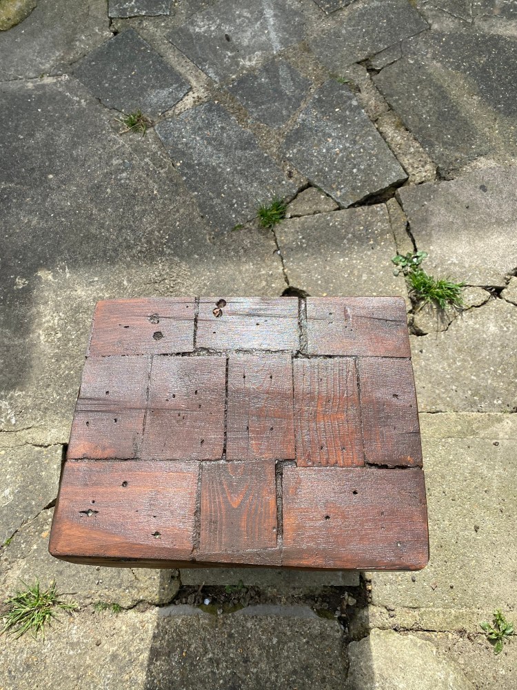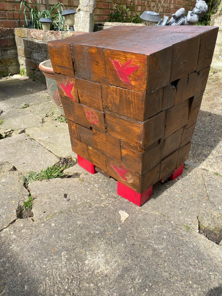This piece is made from pallets blocks. It can be used as a seat or a stand. It has been up-cycled to look like a block of bricks a sturdy piece of furniture that is made for indoors , but looks great used in the garden.