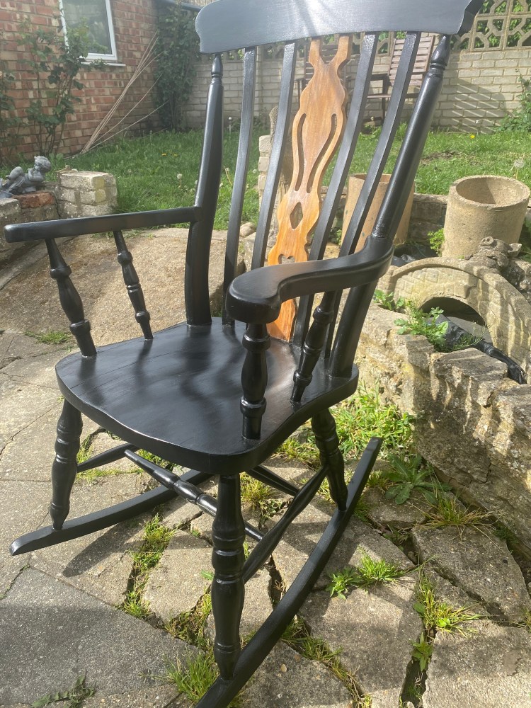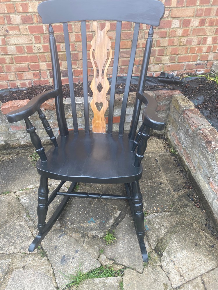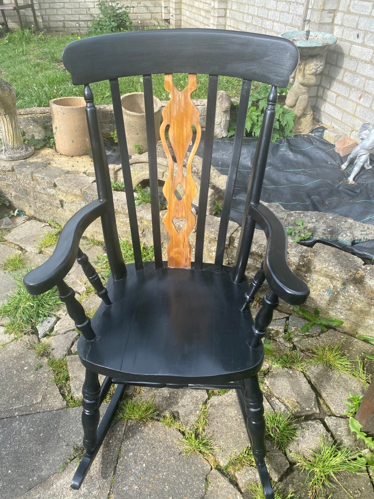 This rocking chair has been rescued and has been up-cycled. It is solid wood and full size. It has been painted and varnished with a lovely contrast with the painted chair and varnished ornate back.
