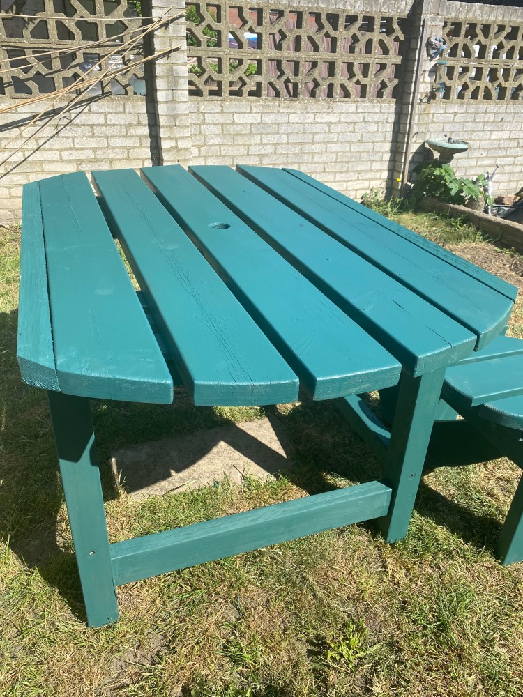 This solid wood garden table is handmade. In it’s previous life it was part of a public house large garden table attached to eight seats.