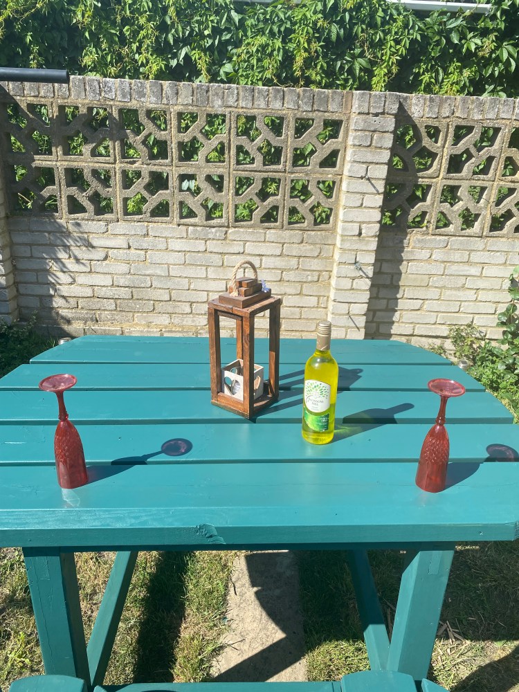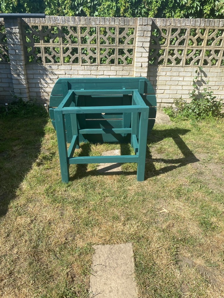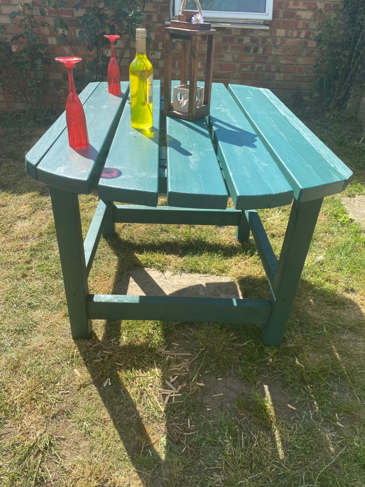 It is now a smaller table with a solid wood base, the legs are from a rescued heavy duty workshop bench. This is a substantive piece of furniture that has been weather protected with three coats of garden paint in a striking sage green.