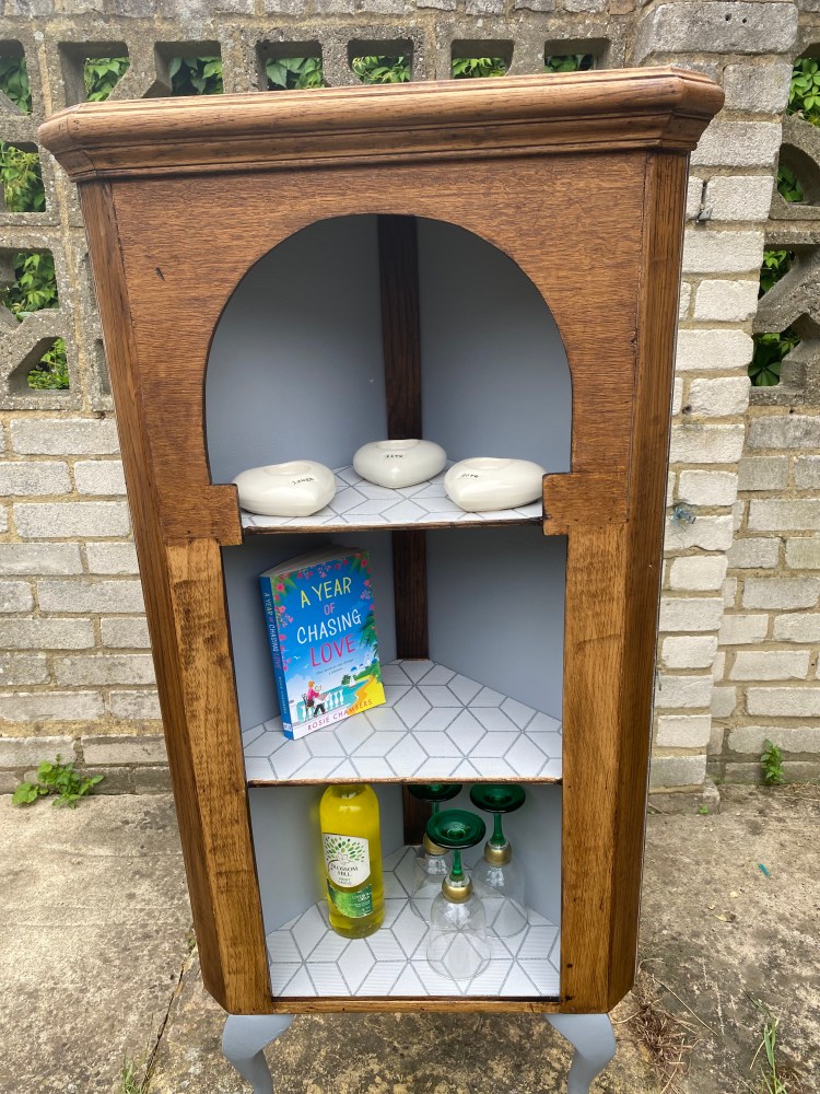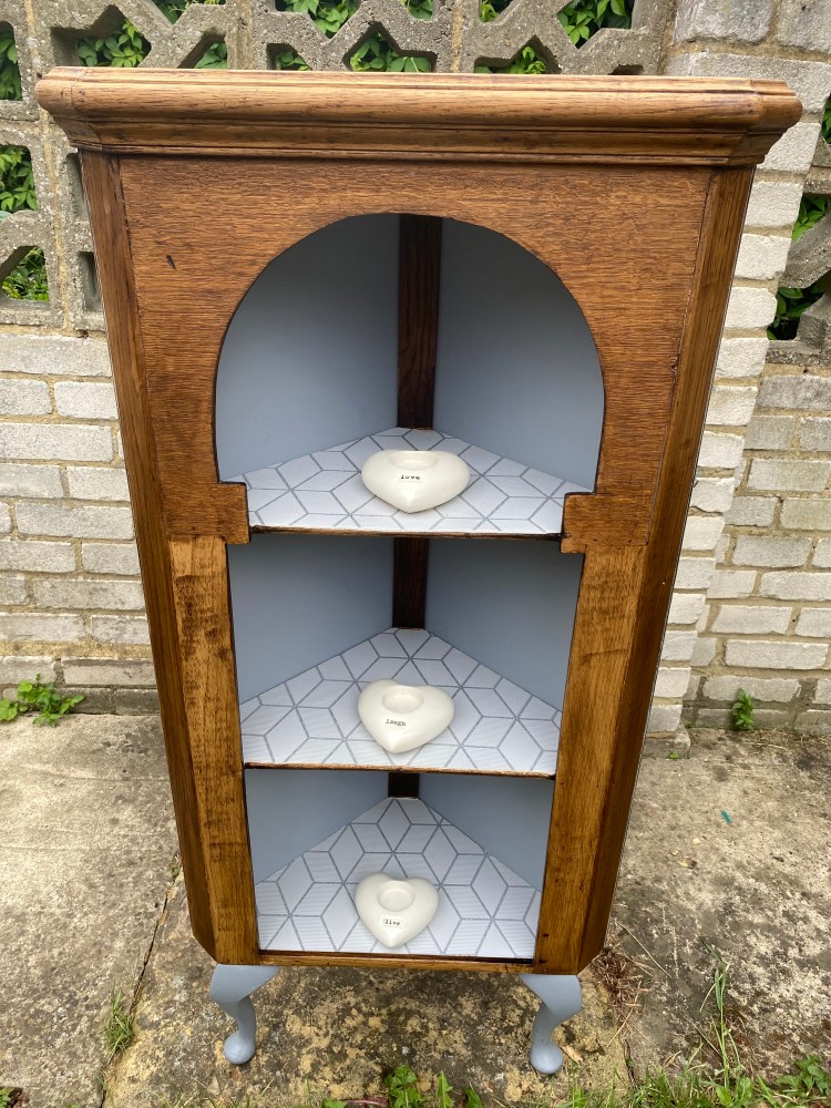 It has been rescued and up cycled into a lovely corner unit. The Bowed curved feet have been added and painted grey to match the decoupaged interior. The original wood has been