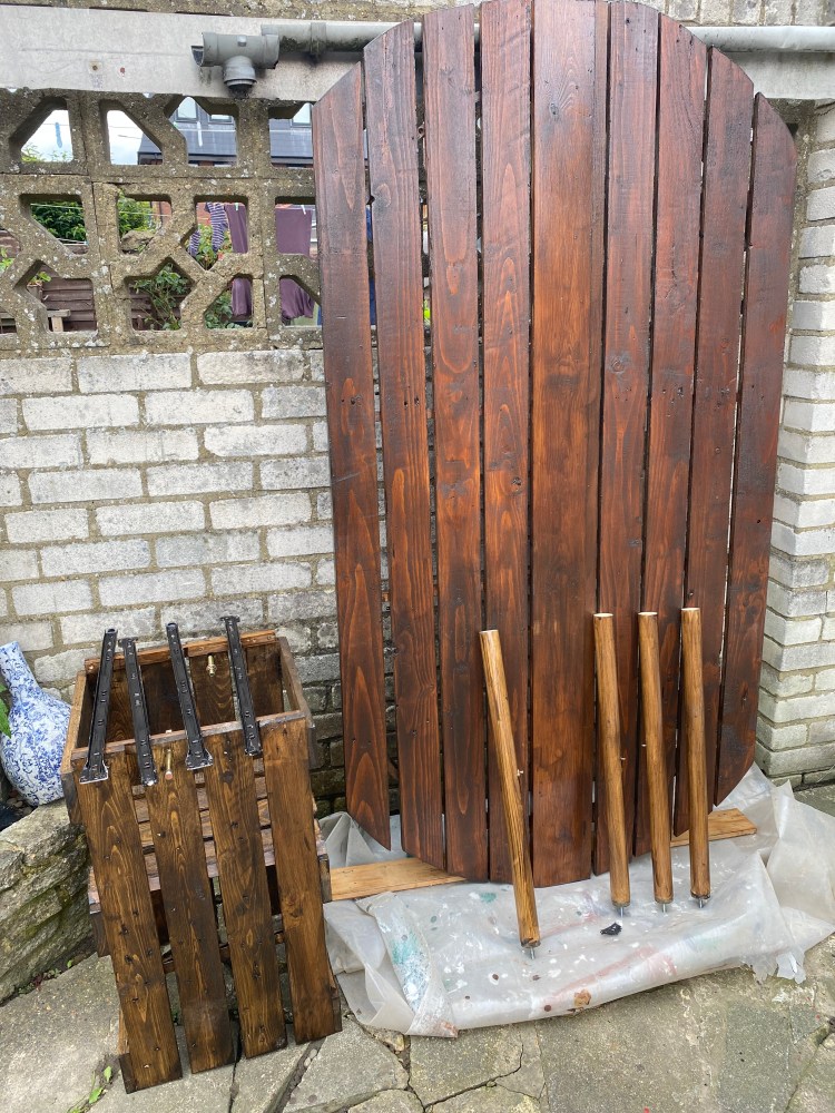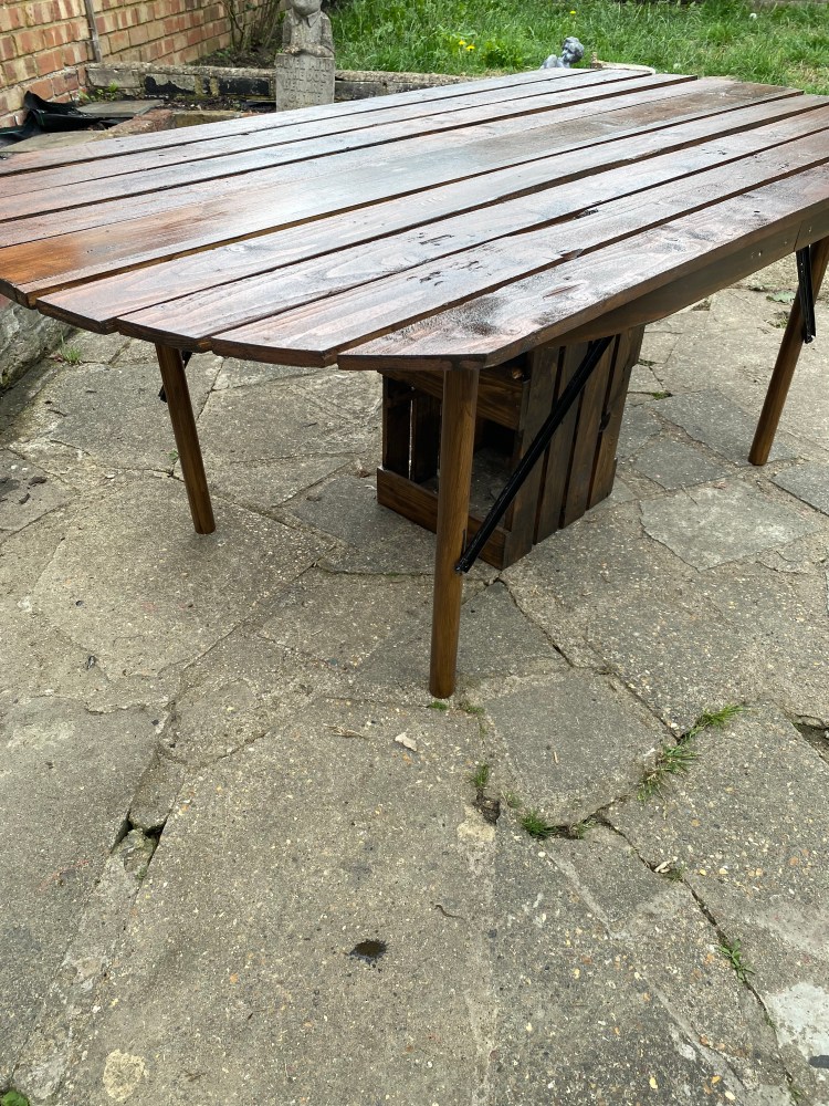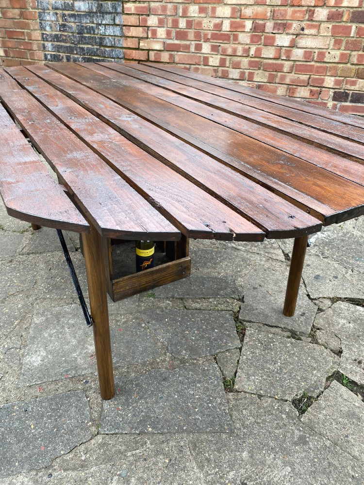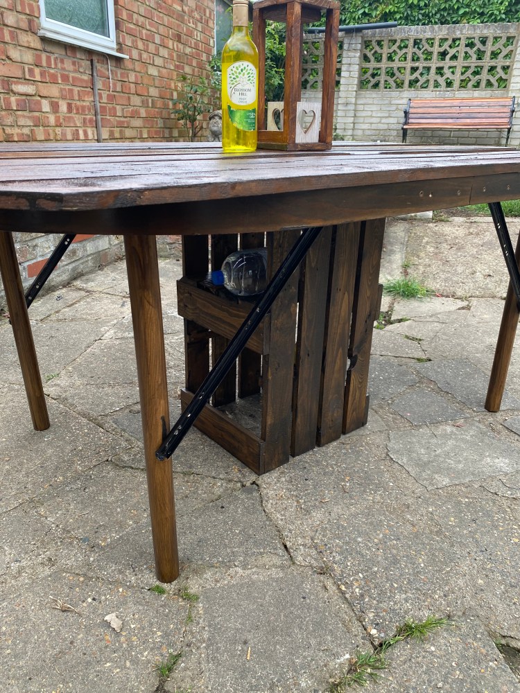 This is a handmade oval shaped lightweight garden table. It has been made entirely from reclaimed wood and even the angles securing the legs are draw runners