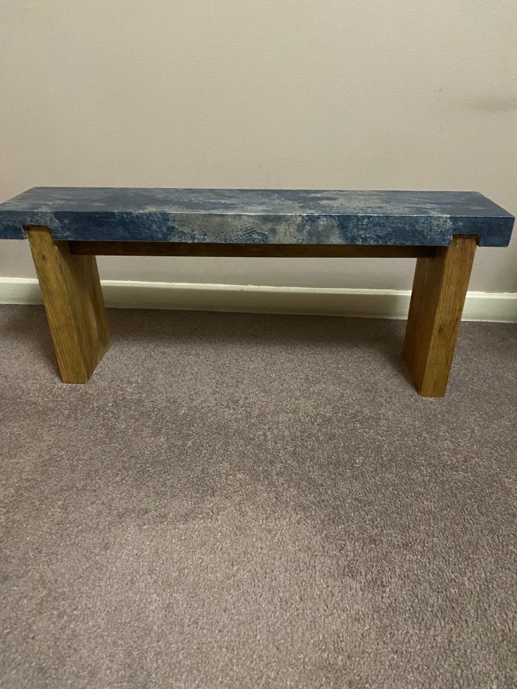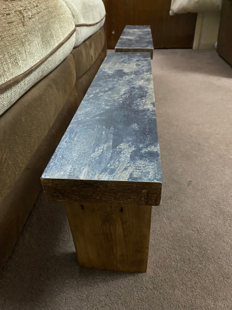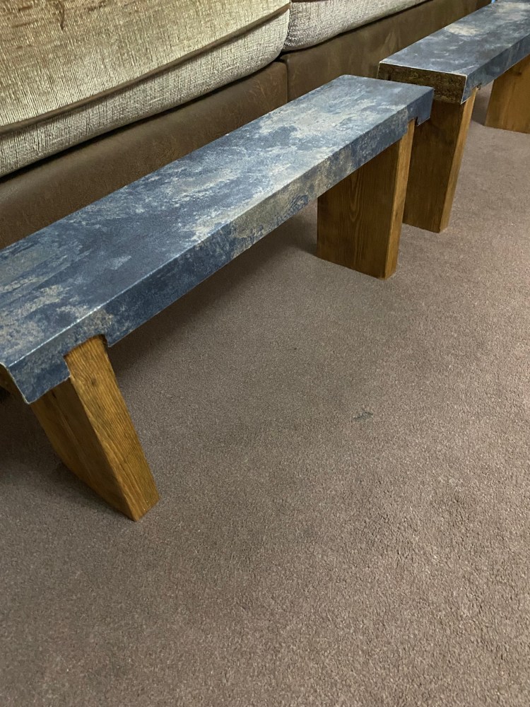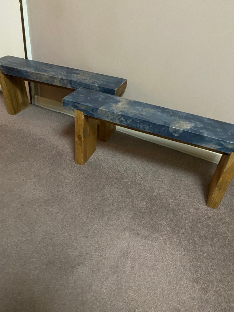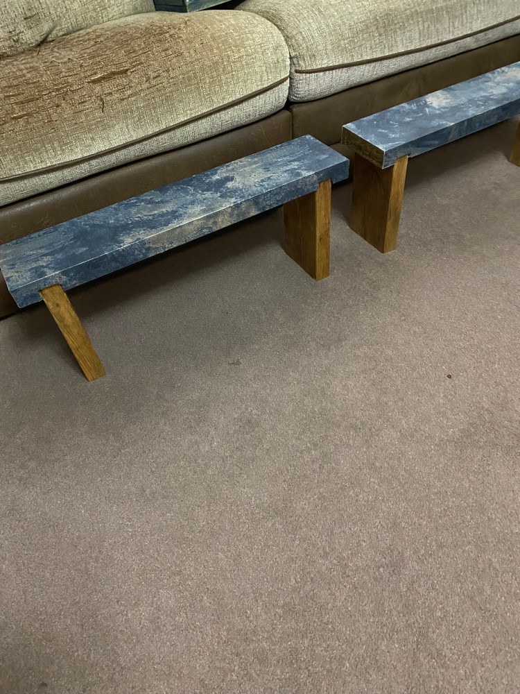 This is a pair of handmade sturdy mini benches. Tastefully Decorated. Though they have been made as a bench they are versatile enough for other uses