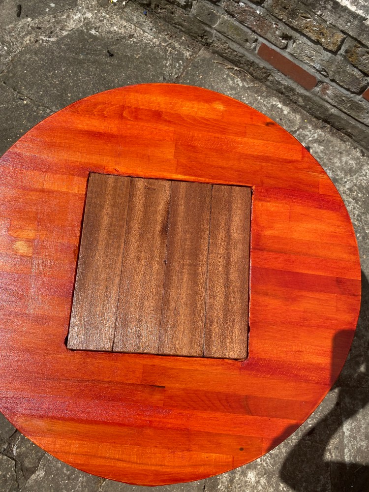 The top has been crafted from solid wood butchers block that have been dyed orange and the square centre piece is made from solid mahogany. The blend of colours gives the table a stunning bright fresh feel.