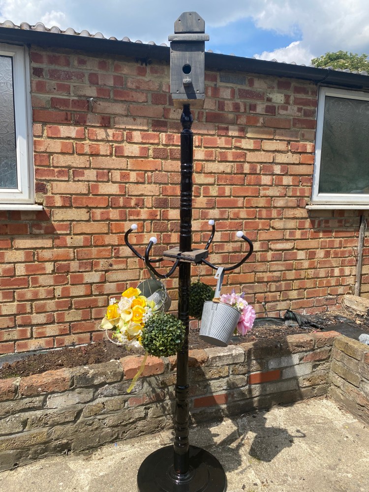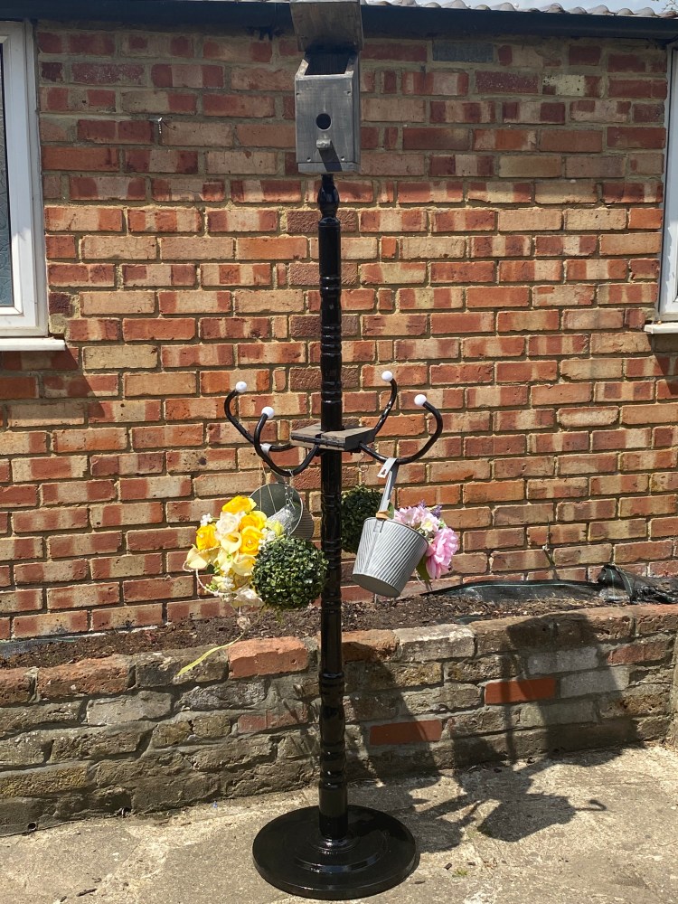 This repurposed piece of garden furniture was once a metal hat & coat stand. It has been transformed into a birdhouse stand with hanging baskets halfway up the stand. It has been painted in black metallic paint offering great weather protection. The birdhouse secured at the top of the stand and is hinged to offer access for cleaning. It is protected in a grey garden paint that blends nicely with the blank stands.