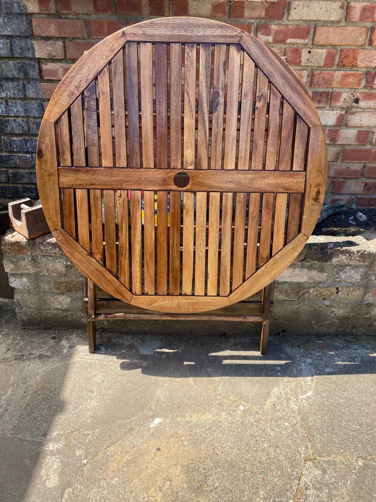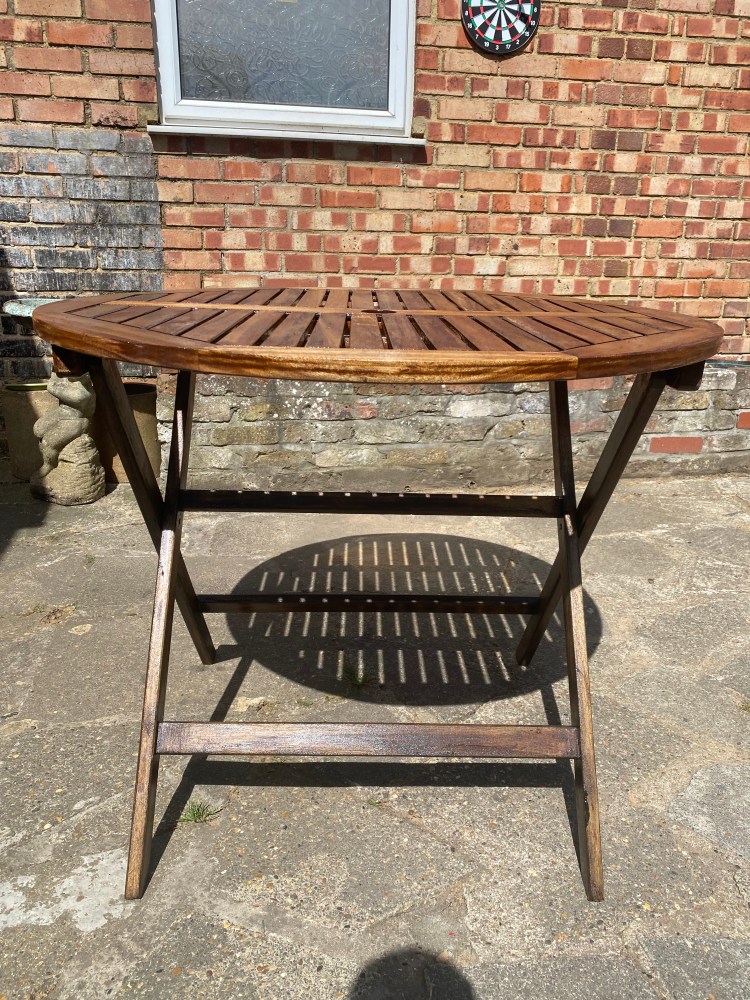 This great little garden table has been rescued and restored. The foldable legs have been stained in weather protecting oak stain. The top has had three coats of yacht varnish offering great weather protection. It is strong and sturdy and in great condition