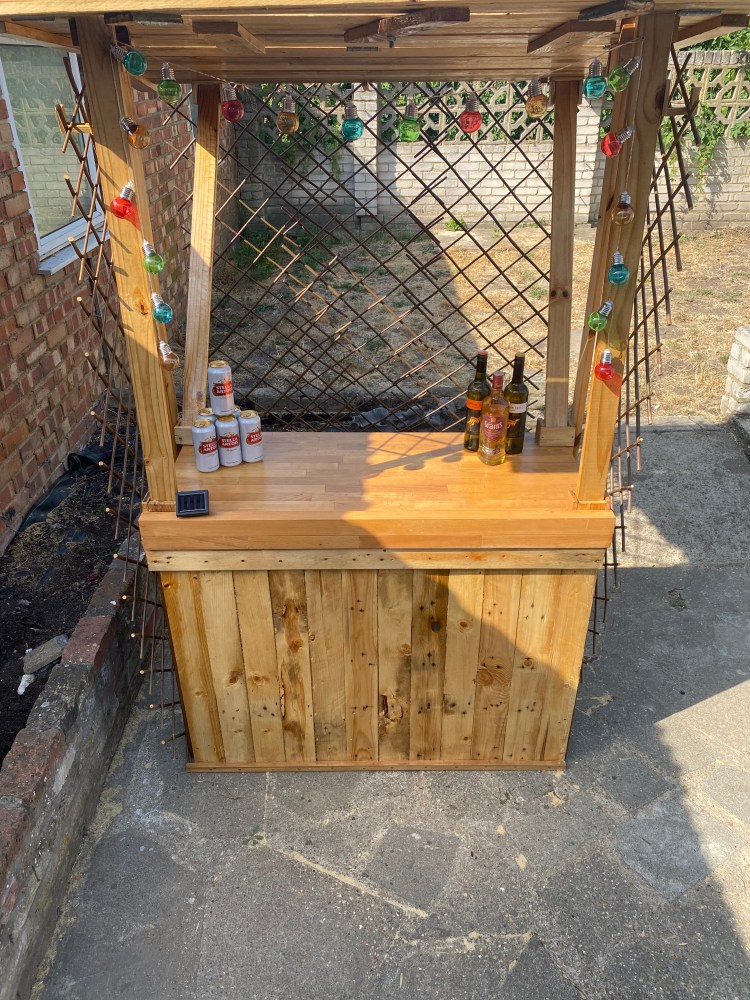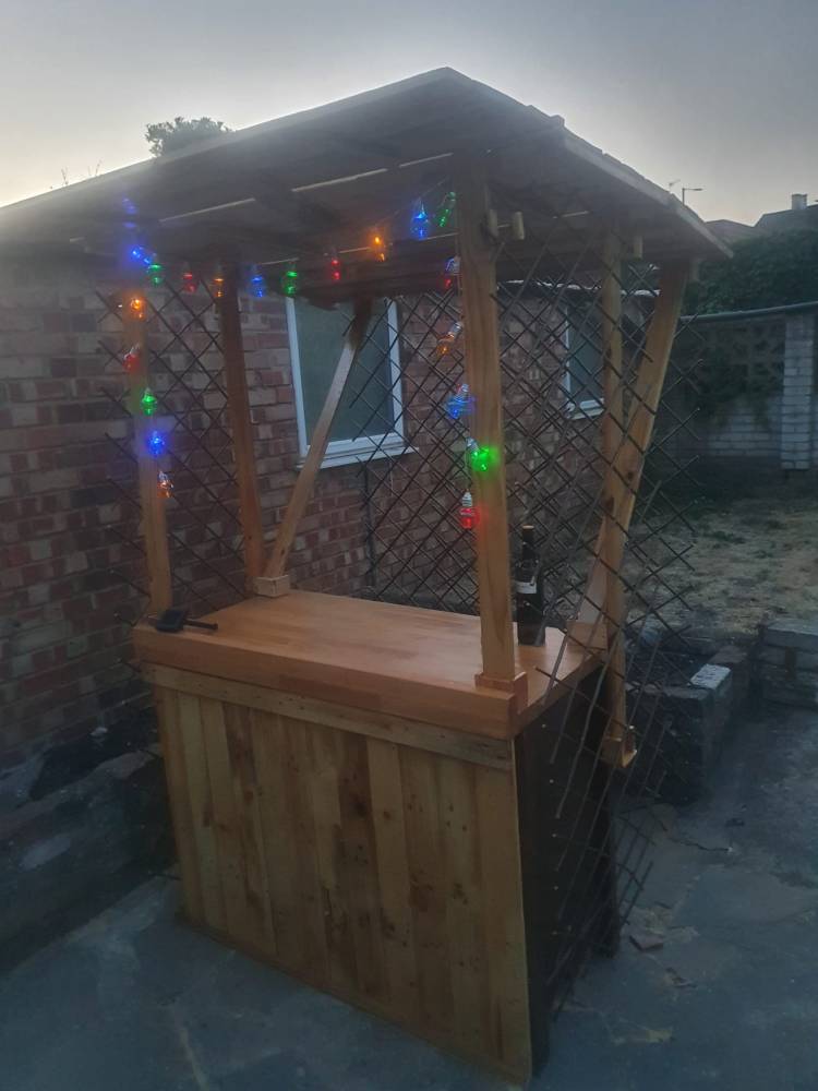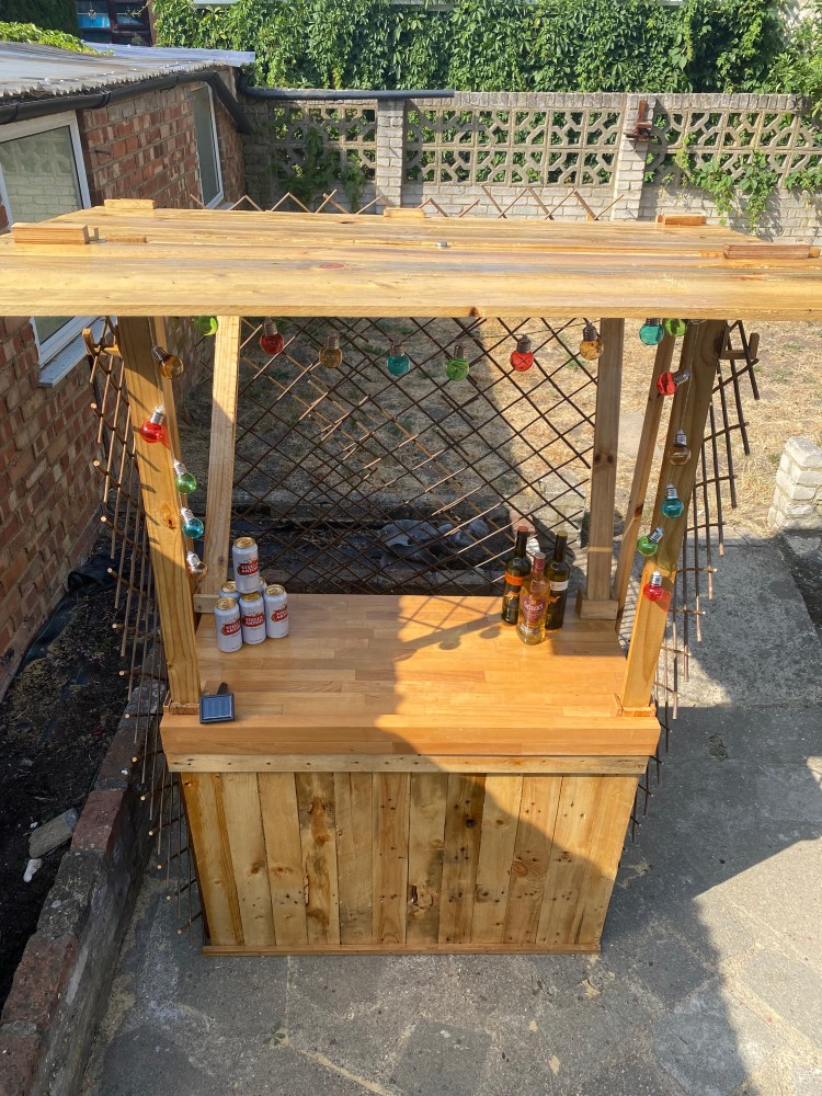 This unit has been adapted into a garden bar. The roof has been made entirely from reclaimed wood. It is hinged at both the front and back allowing it to be folded down when not in use.