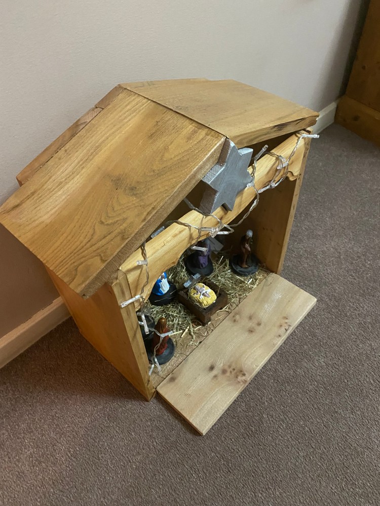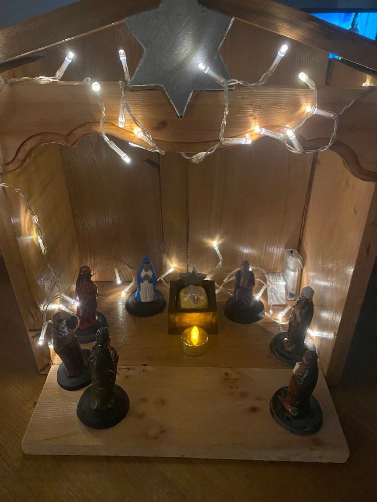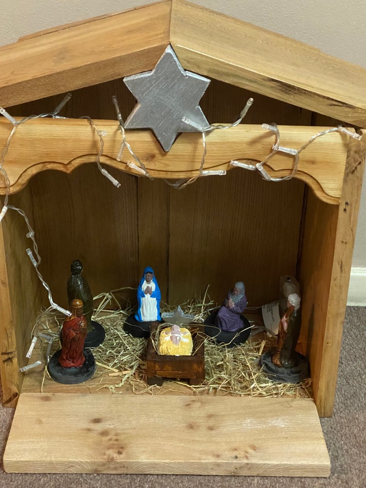 | Christmas lit up nativity scene. This a handmade Christmas scene made entirely from reclaimed wood. The stable is made from elm wood it has been varnished to enhance the beautiful grain of the wood It comes with a small stable a flickering tea light to give the impression if a roaring fire on that cold night. Plus fairy lights are included to decorate and make the whole scene a wonderful central point. It has eight figures; baby Jesus, Mary, Joseph, three wise men and two shepherds It has a hinged flap that extends the stable floor but can also folded up to act like a door DimensionsH=46cm =46cm D=21cm |