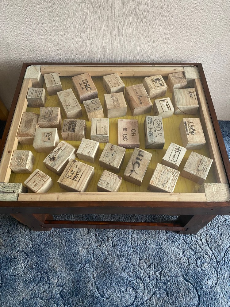 | Handmade Freight Block Coffee Table. This is a a one off handmade table. It has been made entirely from reclaimed wood. It is a sturdy robust table with a heavy duty removable thick glass top. It is adorned with pallet Blocks under the glass, the blocks have different markings and numbers inscribed on them, making it a one-off piece that would suit any room Dimensions: W= 91 cm D= 75cm H=50cm £99 |