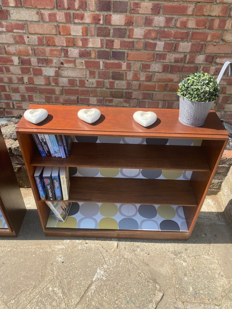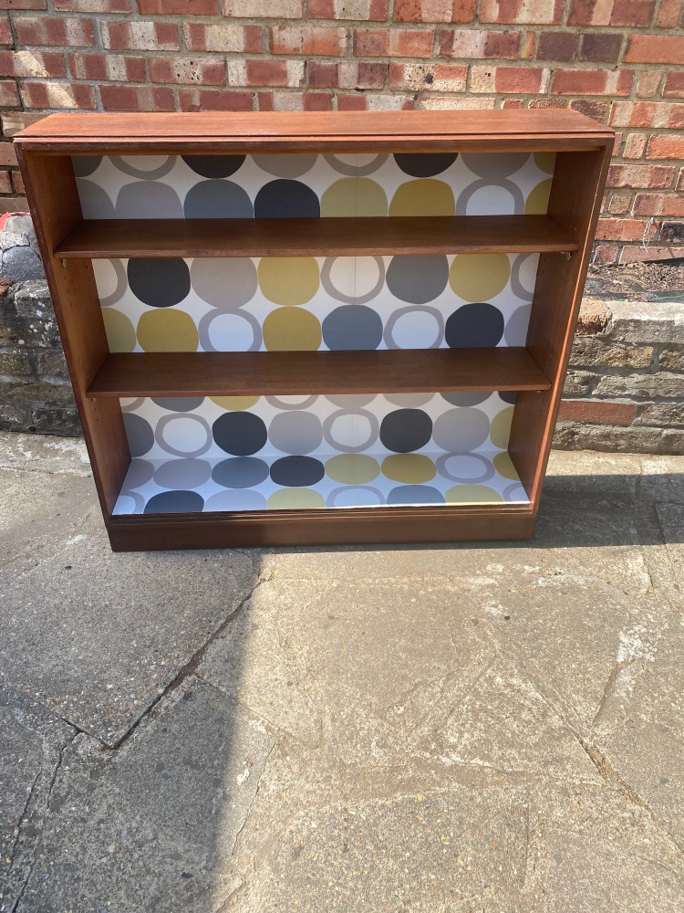 | Hardwood Gordon Russell bookcase. This is a Gordon Russell hardwood bookcase. It has been rescued and restored and has two adjustable shelves. The back and base have been decoupaged giving it a retro feel and a real stand out piece DimensionsW=95cm H=86.5cm D=24cm |