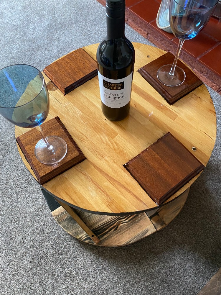 The top is made of solid butchers block with four sold mahogany coasters inset into the wood